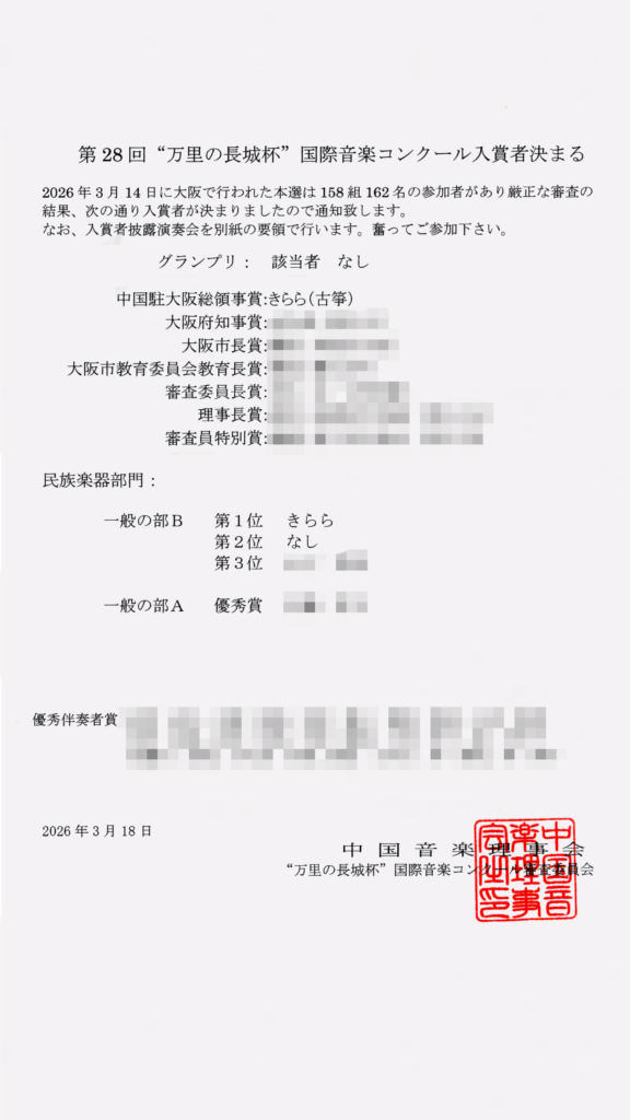 万里の長城杯国際音楽コンクール本選で第1位を受賞しました